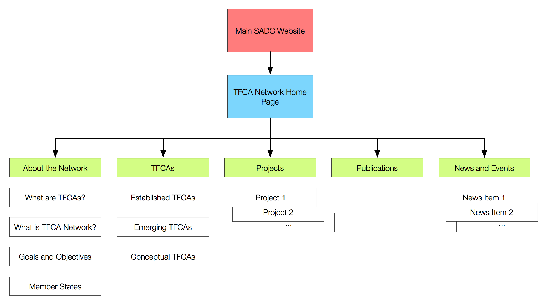 This is the proposed structure for the new SADC TFCA Public Website as per the specification document. This should assist you to plan what content should be submitted to the SADC Webmaster for inclusion on the TFCA section of the main SADC website at www.sadc.int.